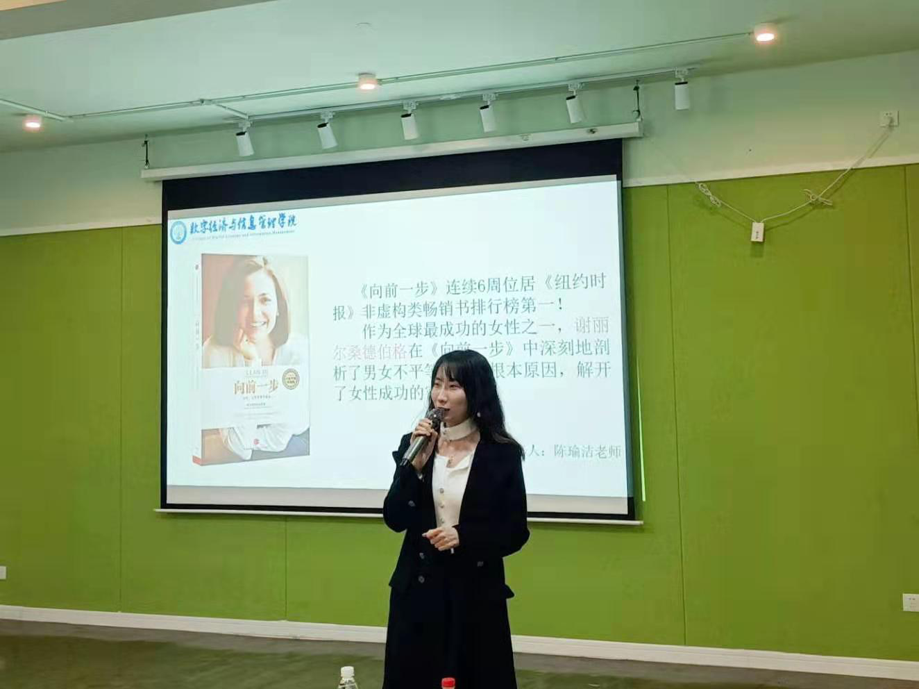 陈瑜洁老师分享了她对于《向前一步》的感悟,她强调主动争取与加强学习能力,并提到;“我们要学习的是学习能力,所谓学习能力,就是在完全没有某个领域的知识的时候,我们能够用最快的速度把它学会并且能够运用”。强调让同学们勇于挑战自我,突破自我,抓住任何机会来尽情释放自己能力,明确自己的职业规划目标,要善于思考,勇于表达,勇敢向前。