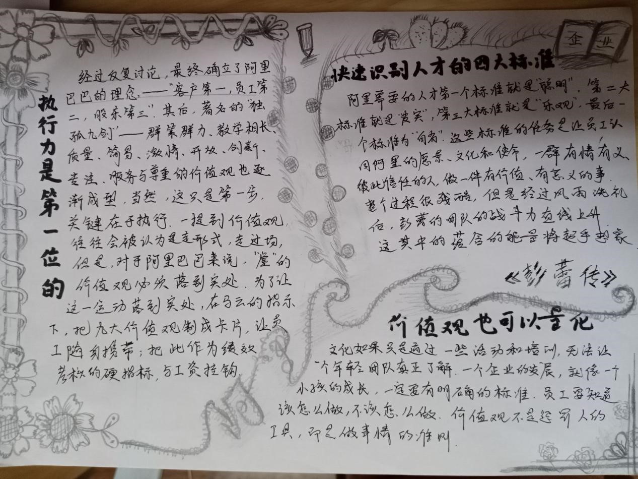 熊顺欣同学读过《彭蕾传》后将自己的感悟做成一副手抄报,通过绘画和摘抄记录心得体会。作品展示成功引起同学们的阅读兴趣,阅读既要有读的过程,也要有结果的呈现。张俊同学以肖像画配文字的形式诉说着《王健林与大连万达》给他内心的触动。所以说,读书结果呈现方式不止一种,同学们以各种各样的方式记录着他们阅读的时光,一笔一划都记录在心里,有专注,有快乐。