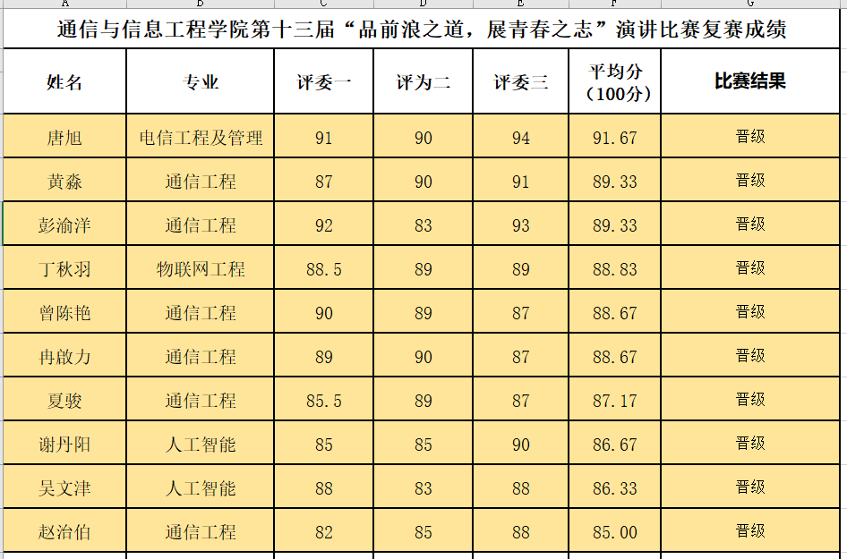 经过1个小时激烈地角逐,10位优秀的选手舌战群雄,成功晋级决赛。比赛选手饱满的热情,慷慨激昂的演讲获得了现场观众的阵阵掌声,他们在一次次演讲比赛后吸取经验,反思自我,不断收获,相互学习,取长补短,共同成长,展现出通信与信息工程学院学生们应对挑战、攻坚克难、敢于担当的良好形象和精神风貌,让我们一起期待选手们决赛的精彩表现吧!