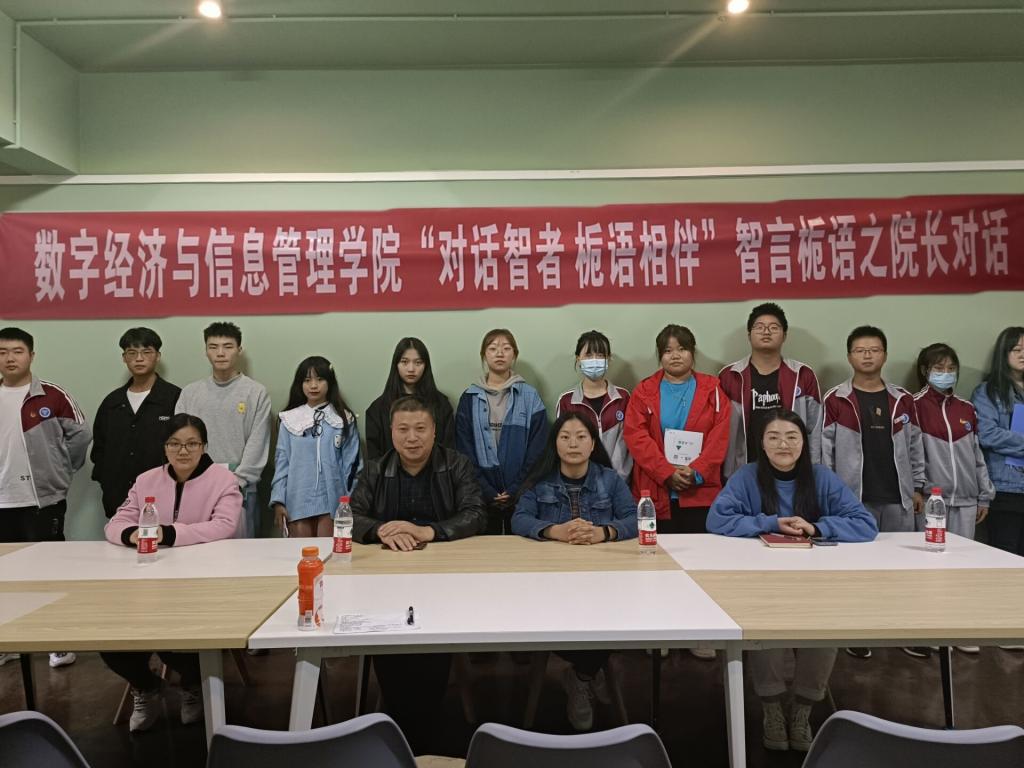 为了更好的促进学院老师与学生之间的交流,解决同学们在校生活的一些问题,便于学院开展工作,数字经济与信息管理学院于10月25日下午14时在双栀书院研讨室开展“对话智者,栀语相伴”智言栀语院长接待日活动。此次活动邀请到了数字经济与信息管理学院院长潘显兵教授,副院长刘贵容教授,任课老师代表徐桂霄老师以及志愿服务板块指导老师2021级辅导员王瑞老师。