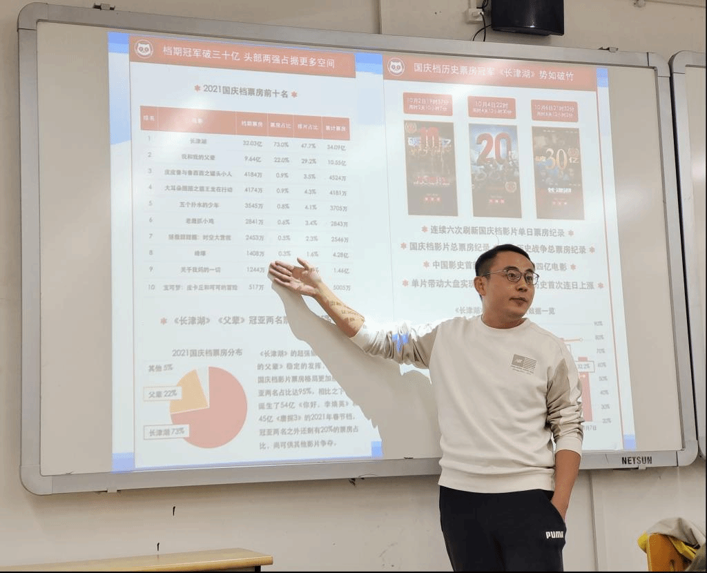 姚磊老师通过生动的案例和详尽的数据分析为同学们展示了电影作为一门产业的新视角,发行、放映、营销等环节在电影产业中的重要作用和丰富表现极大拓展了同学们的电影视野。
