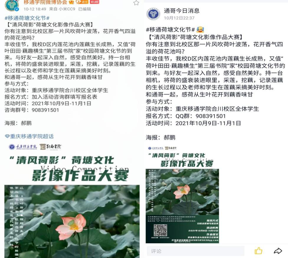 又至丰收佳节,重庆移通学院D区莲花池的莲藕已经成熟,“荷叶田田·藕趣横生”第三届书院“家”校园荷塘文化节也如期举行,由微博协会、别都书院、宣传新闻中心官方新媒体工作室共同主办的“清风荷影”荷塘文化影像大赛随之拉开序幕。