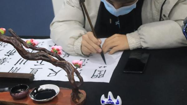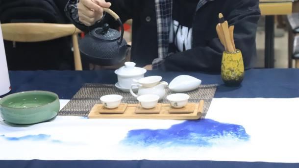 手起手落,一针一线落于其上。非物质文化遗产研究会的刺绣手法现场展示,即使通过镜头也能感受到那一针一线中的精巧。刺绣作为一种历史悠久的手工艺,其中凝聚着深厚的民族文化底蕴,蕴含着着浓厚的中华文化与民族特色。刚劲有力、笔扫千军的民族气节都蕴集在一撇一捺中,推开书法和美术协会的大门,这里此时正进行着篆书和楷书撰写。书法以汉字为载体不仅可与多种艺术相结合,也承载着传统文化和民族精神。继墨香之后是淡雅的茶香,茶学社的茶艺讲解值得像我们月下品茗一样细细品味。茶被誉为我国国饮,也被誉为东方恩物。
