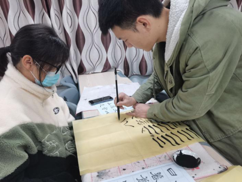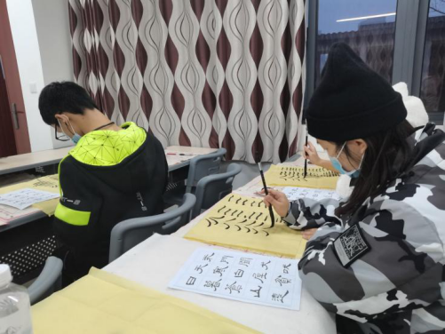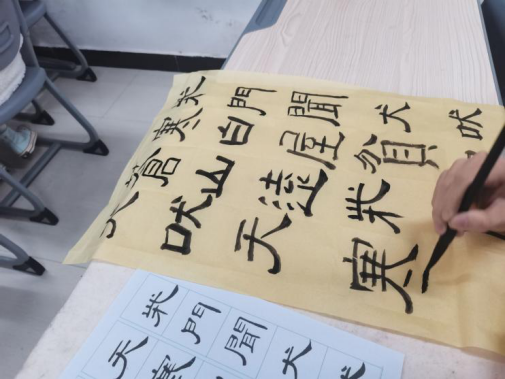 社员们兴奋而又紧张地拿起毛笔,在纸上开始满满书写。部分同学很快便能上手书写且横平竖直;大部分同学并不适应用毛笔写字,笔画写得不平顺,但他们都特别认真练习,认真练好一笔一划。社团干部干事为同学们亲笔示范,解决握笔姿势不正确和横竖不平的问题,隶书临摹也逐渐顺畅起来。
