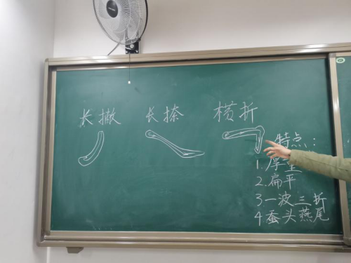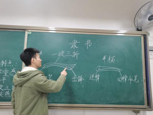 隶书,字形扁方左右分展,一反篆字纵向取势的常态,而改以横向(左右)取势,造成字形尚扁方,笔画收缩纵向笔势而强化横向分展。起笔蚕头收笔燕尾,这是隶书用笔上的典型特征。本次课堂由万家鑫同学进行讲课。从隶书的基本笔画长横开始教学,通过黑板板书进行详细讲解。依次讲解平横、长撇、长捺和横折的书写以及与隶书有关的书法知识,让社员们初步了解并把握隶书字形笔顺。