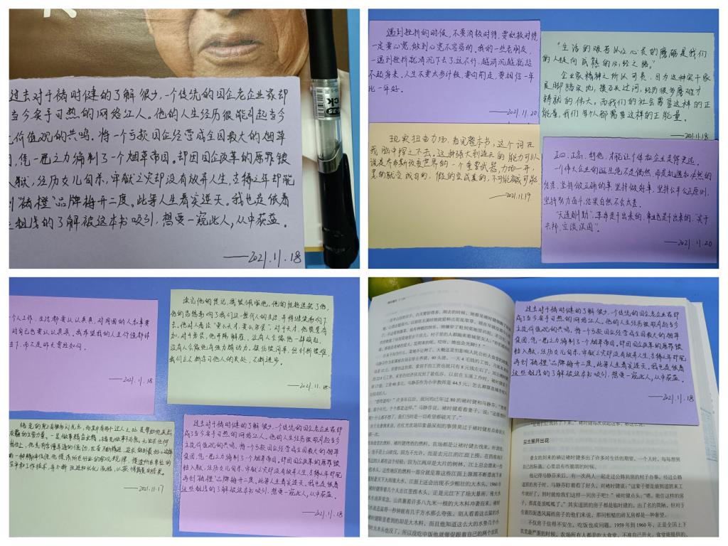 在此次活动的参与中,同学们收获颇多,不仅了解了许多名人们的经历过程,而且从名人们成功的经历中受益匪浅。这次活动一方面,提高同学们的阅读兴趣和能力,厚积薄发,另一方面,“择其善者而从之,其不善者而改之”,发展创造性思维。在问题讨论中,同学们不仅谈论书,还讨论与书相关的很多方面,比如相关的背景和社会现象。同学们谈到,从任正非身上,他们学会了不忘初心,甘于寂寞,严于律己,艰苦奋斗,自我批评的企业家精神。董明珠让同学们懂得吃苦、独立、不服输,勇于跳出舒适圈,只为遇见更好的自己。马云让我们明白只要努力,坚持不懈,未来就在前方。相信同学们在今后人生道路上一定会披荆斩棘,收获成功。