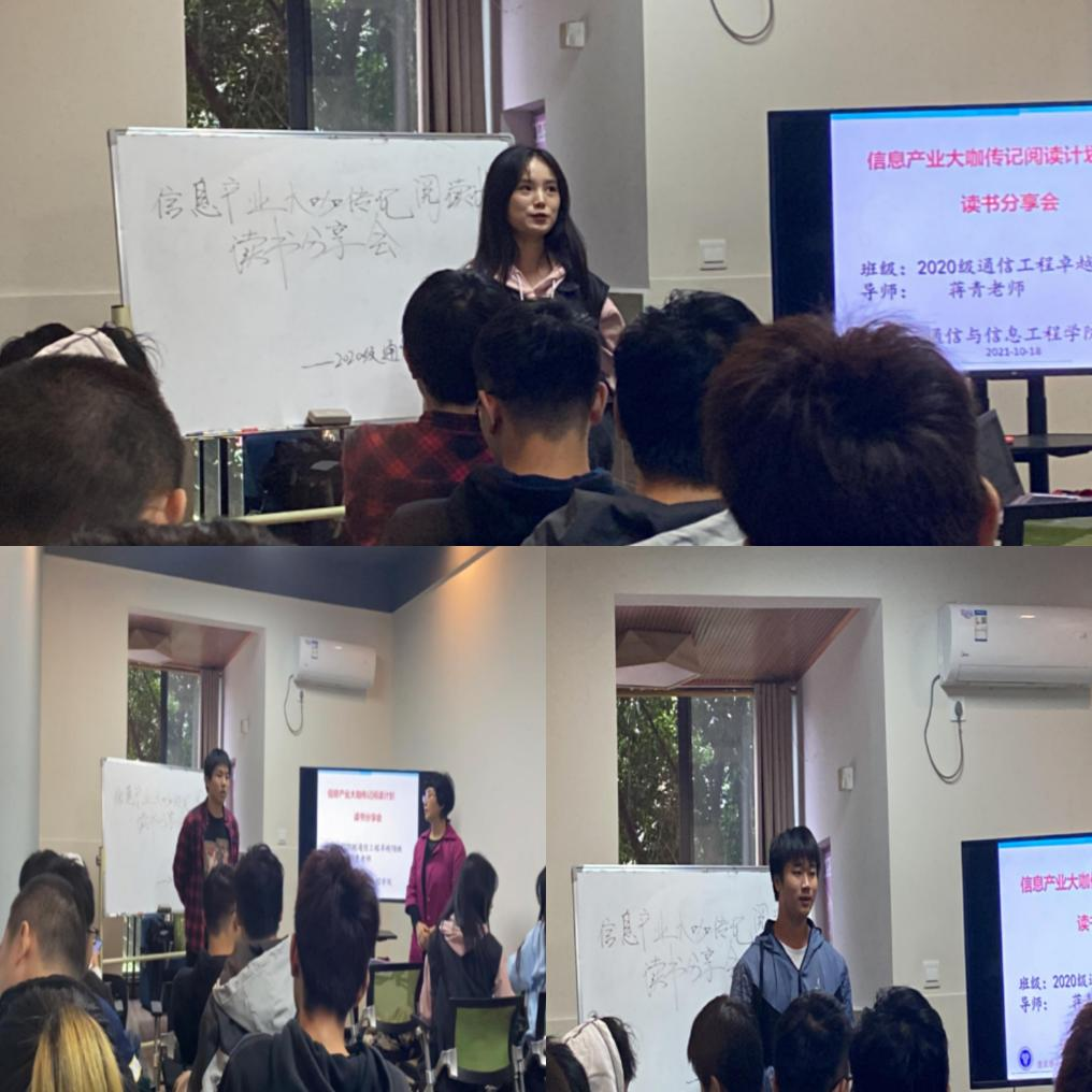 培根说“读书给人以快乐、给人以光彩、给人以才干”。为贯彻落实我校“信息产业商学院”的办学定位,培养未来社会的中坚力量,2021年10月18日下午4点,通信与信息工程学院2020级通信工程卓越18班的同学和学业导师蒋青老师在廊桥书院树洞会议室开展了信息产业大咖传记阅读分享会。