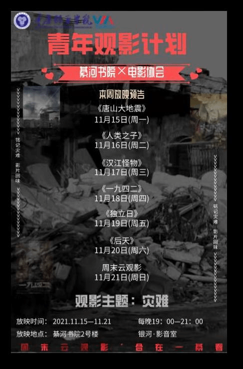 细看电影、品味人生,不同的电影领略不同的风情。为丰富学生课余生活,用电影教育给予我们生活启示,綦河书院与电影协会联合举办的“青年放映计划”放映持续进行中。本期观影的主题为“灾难”,通过这些影片可以使我们更为直观的了解大自然灾难的威力,同时希望大家能够养成尊重自然、敬畏自然的习惯,灾难面前,人如沧海一粟。