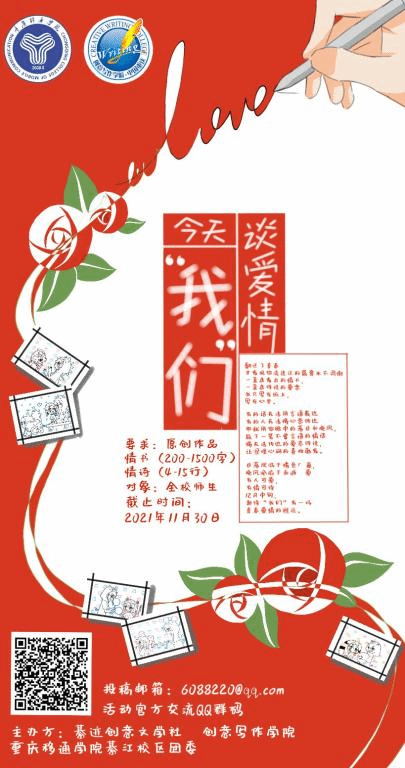 11月15日,綦江校区綦迹创意文学社发布了“今天,我们谈爱情”的情书征文活动,截至目前已超450人报名参赛。不限文体自由表白、作品有机会在全校联展、和知名作家对话,这就是来自“情书”征文的神秘力量。