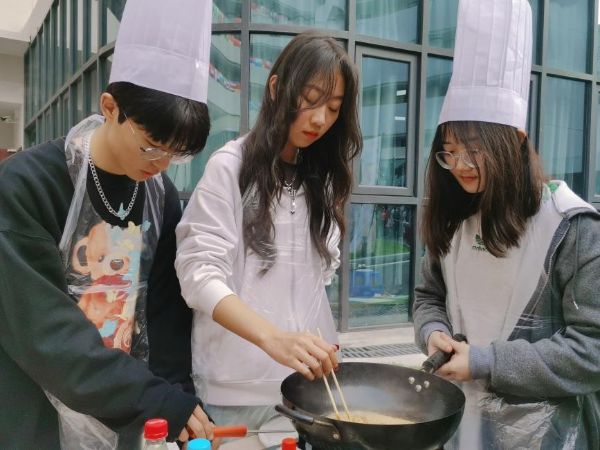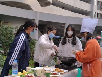 紧接着进行了期待已久的厨艺比拼环节,整洁的案板上摆放着各色食材,各位“厨神们”手握菜刀信心满满。仿佛看到了属于记忆里的“音乐厅”,案板声就像厨房音乐厅里演奏出的绝佳的音乐。现场还邀请到重庆移通学院美食协会的同学们,为本次厨艺大赛增添了不一样的色彩。选手们各展神通,用炒、煎、炸、煮等方法,让最普通的食材变成色香味俱全的佳肴,再安排菜品与艺术来一场邂逅,让朴实无华的食材瞬间脱胎换骨,成为全场最佳。