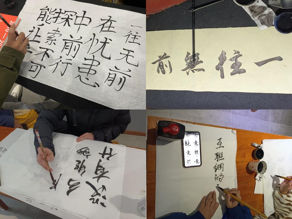 在北山书院朱以豪、张辉林两位同学的带领下开始了百匠工作室书法活动。通过书法练习,写出书籍《一往无前》中令自己印象深刻的一句话。随着“阅前辈经验,读百味人生”与“一往无前”等毛笔字呈现于宣纸之上,同学们深受触动。