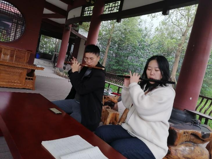 在通过学习竹笛基础指法与基础音符后,社长将詹永明《笛子基础教程十四课上册》内“练习10”给社员们进行统一演习,社员们开始逐步跟着书上节奏大胆进行尝试吹奏,虽然中间夹杂着初学者们的通病,但是勇敢尝试吹响音符就是一个进步。