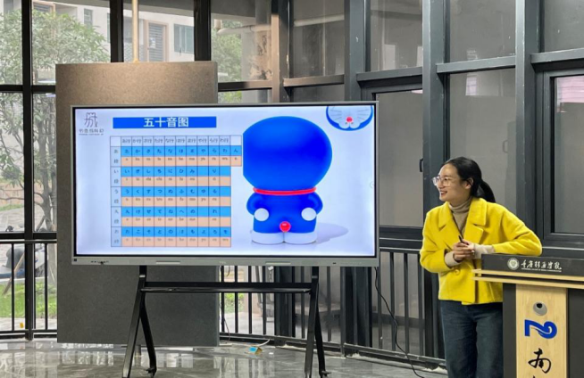 李老师便播放《哆啦A梦》的主题曲《哆啦A梦之歌》,让同学们在动画里初步了解日语,用“五十音图”引导同学们,让大家对日语产生兴趣,同时与同学们进行互动,让同学们更加了解日语,李老师亲切的话语也温暖这个寒冬里每位参与国际部活动的同学们内心。