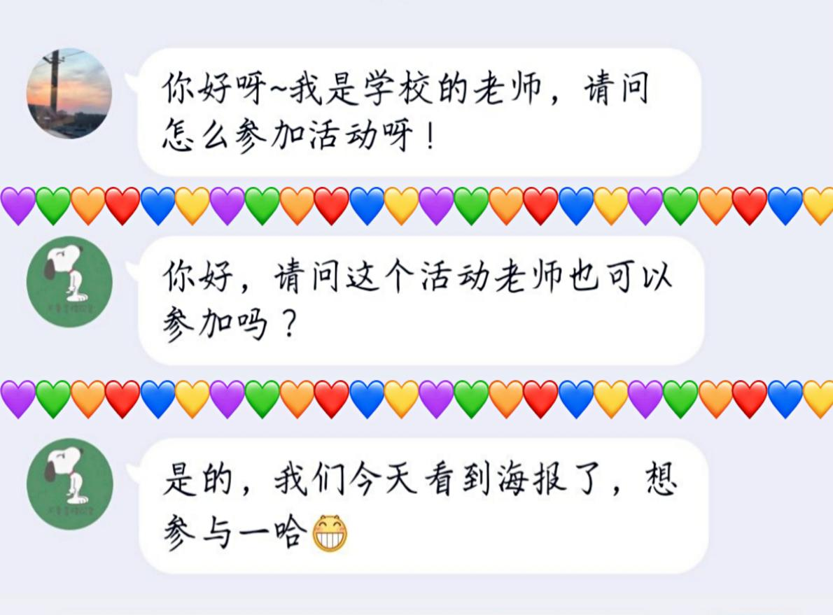 情书活动的火热开展,同样也吸引到了老师的目光,在征文进行中的某一天晚上,我们收到了来自一位老师的消息,在看到綦迹创意文学社对情书征文的海报时,ta向征文小组群询问“老师是否也能参加”,表示看到后也很想参加,受到老师的支持,我们倍感兴奋!指导老师萧婷婷当即决定,专门设立一个老师匿名投稿组,为那些美好的爱情设立一道快速展示通道。