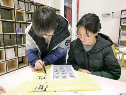 大家在临摹过程中出现许多问题:笔画轻飘且字形扭曲,既破坏字的重心,又损伤隶书质朴稳重的特点。万部长针对这些问题进行耐心讲解,及时进行纠正、演示操作,帮助大家更好的学习。练习中,同学们相互帮衬,一字一笔认真写下每一个汉字,毛笔在同学们手中逐渐熟络起来,