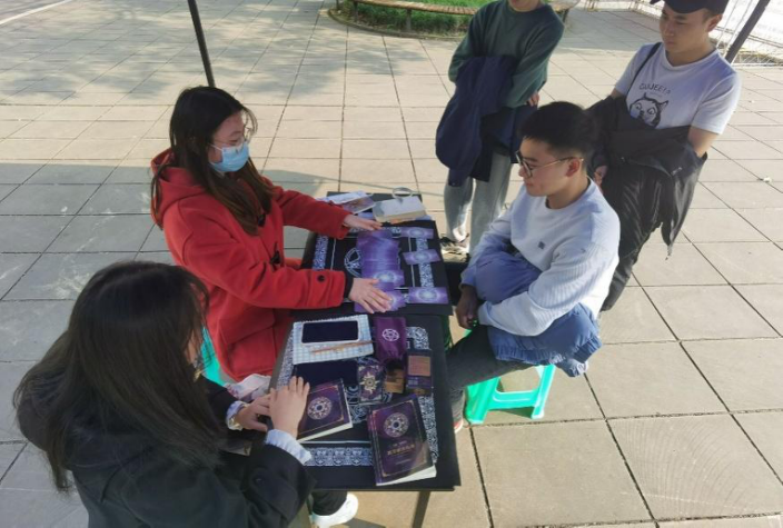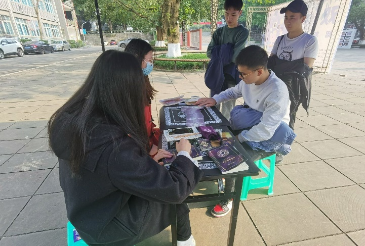 活动当日,工作人员早早来到黄桷树广场值班点进行现场的布置。社团内部工作人员分工明确,忙中有序地为同学们占卜。路过的同学们对塔罗牌充满了好奇,迫不及待地加入到占卜活动中。现场气氛活跃,塔罗牌社员向同学们普及塔罗牌知识:塔罗牌分为大阿尔卡那和小阿尔卡那两种牌型,分别对应不同需求的占卜。同学们兴致立刻提升起来,不断询问工作人员塔罗牌的相关介绍,在一片欢声笑语中与工作人员进行互动,体验占卜带来的乐趣和魅力。