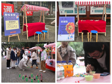 一个个摊位上,师生们进行着与童年回忆相关的小项目。“套圈”“母鸡下蛋”“夹弹珠”“口是心非”“指压板跳绳”“摸石过河”六个童年项目同时进行,以第二课堂的方式积极打造学习生活一体化书院。