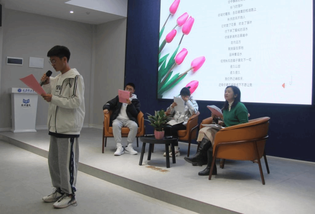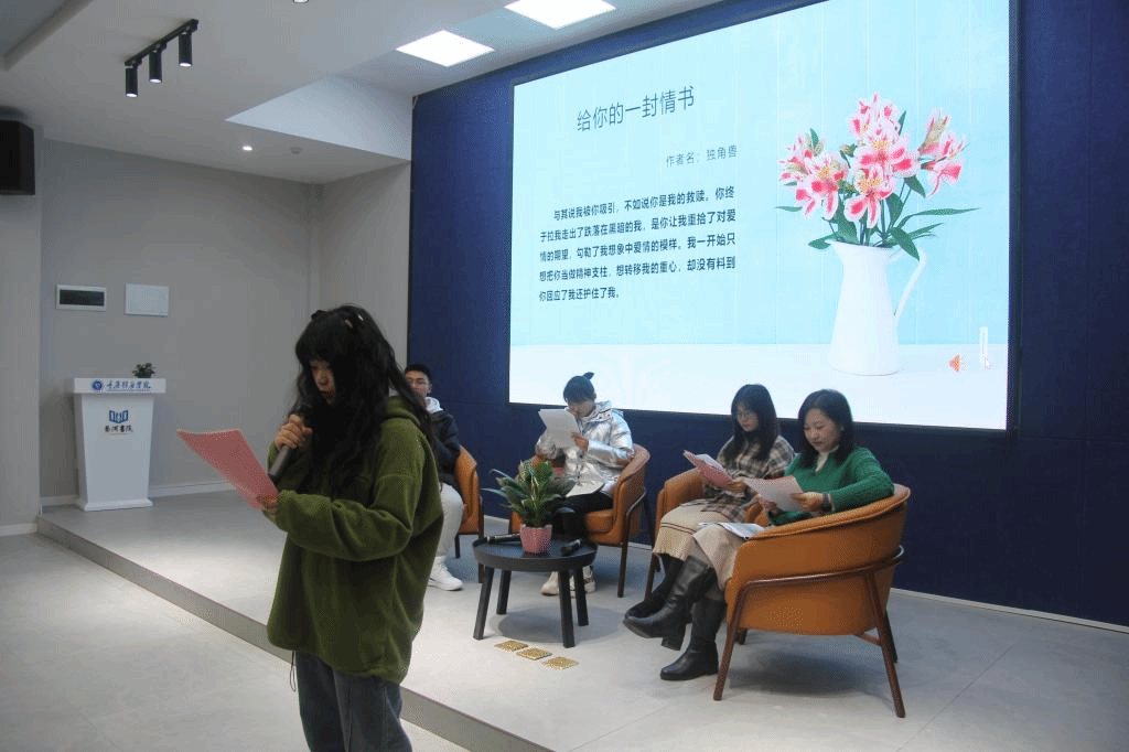 这四篇作品分别是王荣燚的《爱意》、从心的《然后,我们之间没有了然后》、雷琅壹的《蝴蝶结》、独角兽的《给你的一封情书》。蕴含情感诗意的文字,被文学社同学们如倾如诉、婉转动听地朗诵出来,更显语句的真挚、多情,把在场同学都带到了那美好纯洁的氛围之中。