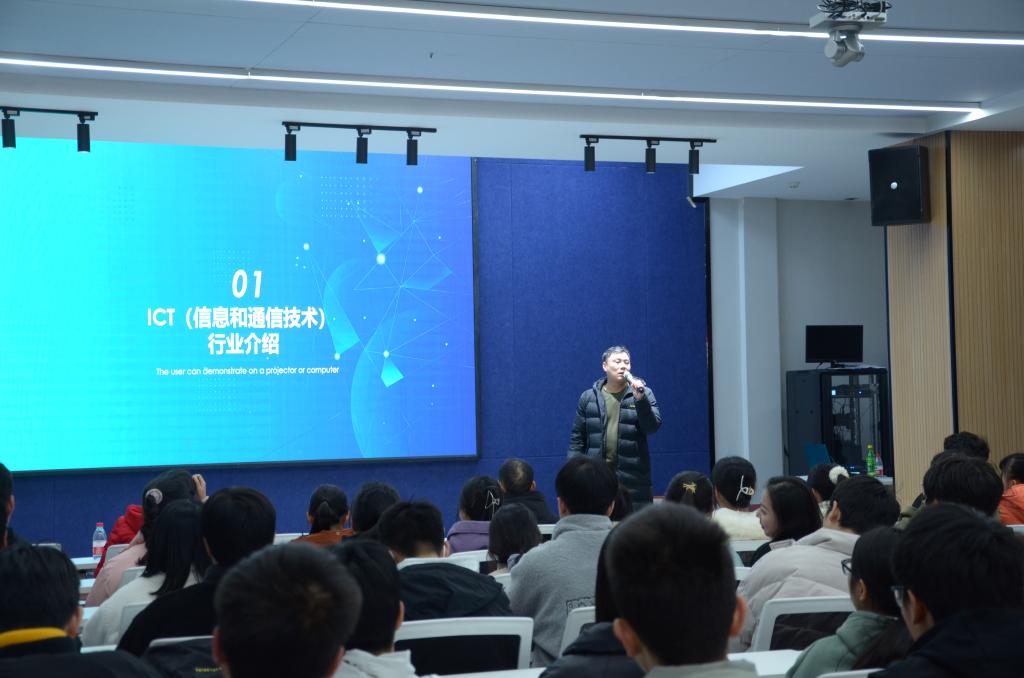 分享会伊始,王微昕老师讲到:“根据这次秋招情况来看,我院在这次秋招中就业指标有了很大的提升,今天我就带着五位优秀的学长给大家分享他们整个大学的经历与经验,希望大家把他们当作榜样,向他们学习”。随后,王老师介绍了ICT行业的就业方向,他很明确地表明当前该方向就业前景广阔,鼓励同学们要学好基础知识,掌握基本技能。
