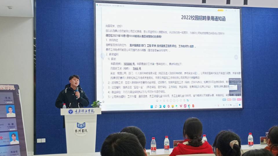 周逸恒和向攀学长分享了他们的招聘经历:他们都表示丰富简历的内容很重要,在个人技能方面,需要把握时机进行系统培训。英语四级证书是很多企业所要求的,需要重视这个门槛。除这个门槛需要重视外,很多企业需要学生工作经验以及校外实习经验,这方面也是需要引起重视。