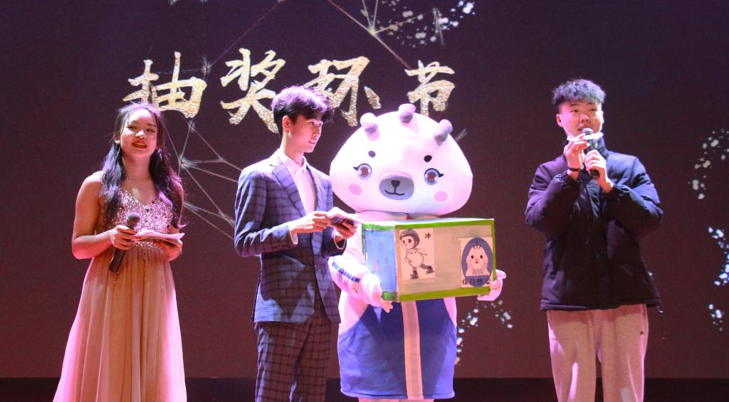(毛超老师与学生社团联合会吉祥物“阿团”进行抽奖)