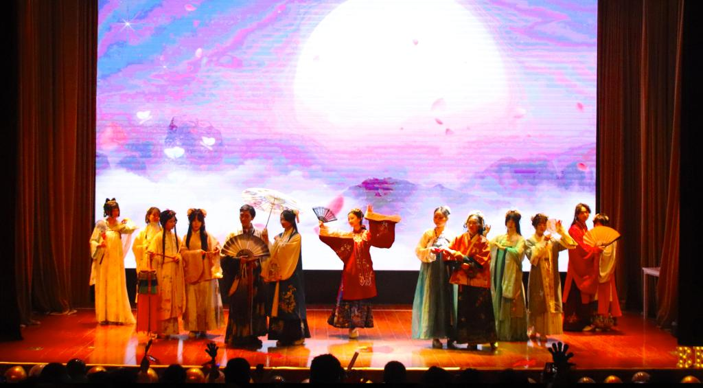 总结表彰大会的表演已过半但同学们的热情丝毫没有减半。伴随着悠扬的音乐,华韵汉服协会以走秀的方式将同学们带入国风的世界,展现五千年华服之美;钓鱼城研究会以朗诵讲述钓鱼城历史文化,不忘先辈事迹,传承红色精神。2021年度各学生社团百花齐放,涌现出“惊人”力量,由重庆移通学院副校长李文豹老师颁发特殊奖项,期望他们下学年继续以“惊人速度”向前奔跑。V+短视频协会社长肖广玉以《走一步,再走一步》向所有社员传递属于社团人的精神,散发属于社团人的魅力,正如她所说:“你现在所认为被浪费的时间并没有被浪费,早晚有一天它会以另外的方式回报你。”