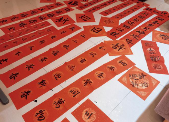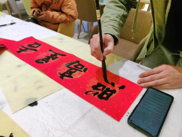 红纸悉心铺开,蘸好笔墨,凝神聚气,毛笔落在喜气洋洋的红纸上,潇洒自如的字一个个跃然纸上。同学们有的书写"阳春岁月峥嵘路"、"江山依旧景长春"以表达对祖国繁荣富强的祝福与期望。有的书写"事业有成满堂春,财运亨通全家乐"是对家庭和睦与业峻鸿绩的美好向往。有的书写"足迹半天下,心知唯故人"充满对友谊的温情与感恩……一幅幅火红的春联带着冬日温情舒展在桌面上,我们拥有期望而书写祝福,提前感受节日气氛,体验到中华传统民俗文化的魅力。