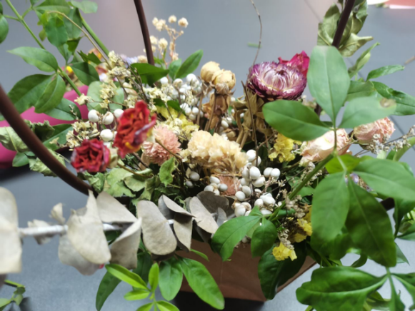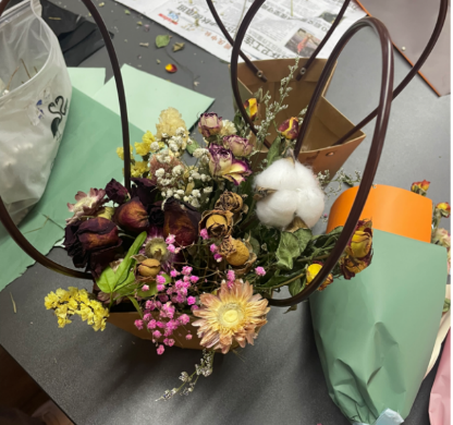伴着阵阵花香,同学们在教学部成员的指导下,开始插花以及干花花篮制作,在同学们遇到困难时,教学部成员积极解决同学们的问题,耐心地讲解插干花的方法、花束的包装以及干花在花篮中的摆放。花香弥漫,同学们也沉浸在插干花和制作干花花篮的乐趣中。