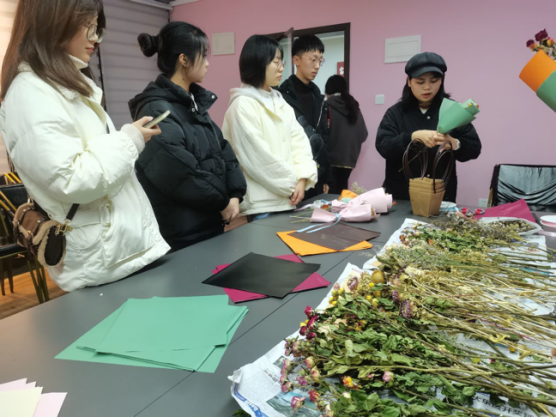 到达爱莲书院多功能会议室后,同学们看着桌上的一支支色彩缤纷的干花,跃跃欲试。随后,花卉协会社长窦雪莲为同学们讲解插花和包花以及制作干花花篮的方法,并进行示范。