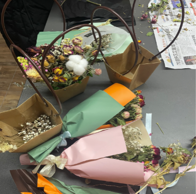 活动伊始,花卉协会准备丰富的制作材料以供同学们创作自己心仪的花篮及花束。各种干花整整齐齐的躺在桌上,它们,将被赋予创造力和美感,在同学们的手中蜕变成一件件艺术作品。
