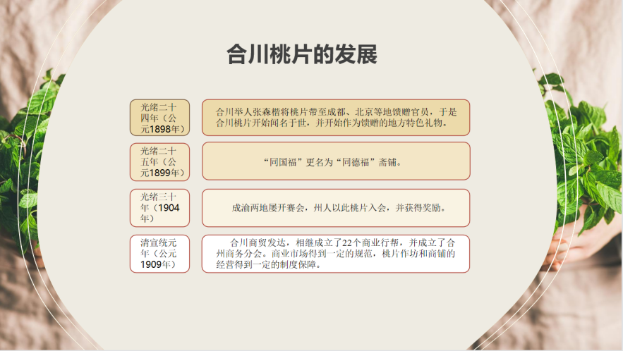 对于合川桃片的发展进程徐靖同学也作出详细的讲解。民国初期,军阀混战,盗匪猖獗,商业萧条。面临破产的蒋盛文,便将“同德福”商号全部顶出交与余洪春之子余复光经营。在一系列的发展变革之中,同德福桃片的质量在同行中遥遥领先,在战乱年代能够稳步发展,并取得一系列的荣誉。在各种荣誉的刺激下,合川制作的桃片在市面上十分畅销,生产桃片的商号迅速衍生。此次桃片发展史的讲解让同学们充分了解年代背景,同时爱国民族心油然树立心中。