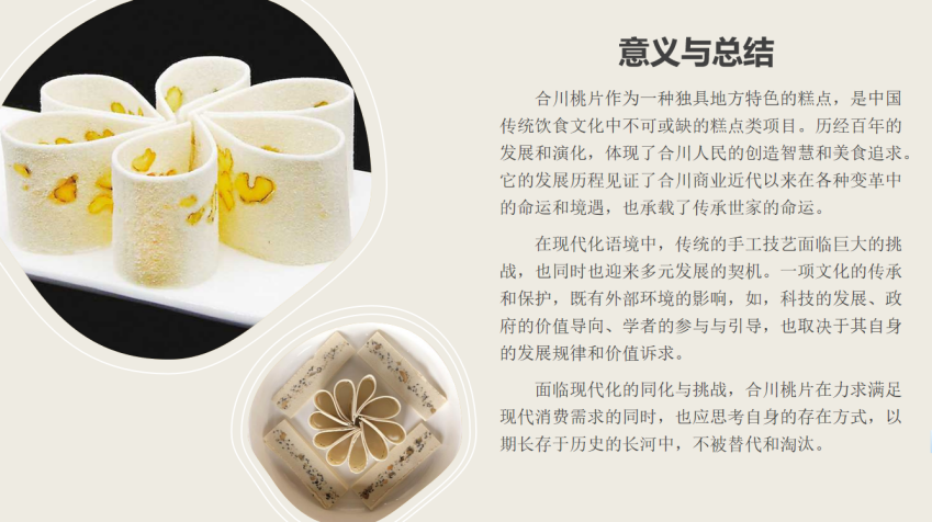 合川桃片历经百年的发展和演化,体现出的是合川人民对美食追求和对传统文化继承与发展的决心。它的发展历程更是见证了合川商业近代以来在各种变革中的命运和境遇。通过这次讲解,让大家深刻体会到合川桃片背后精益求精的工匠精神,对处在这快节奏时代的同学们来说弥足珍贵。作为当代大学生,铭记历史经典,继承美食文化内涵,珍惜每一次与传统美食的相遇