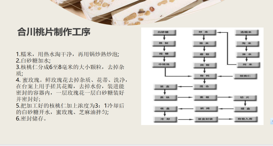 合川桃片源于清光绪二十一年(公元1895年),迄今已有120年历史,是以糯米、核桃为主要原料的糕点类小吃。合川桃片问世于县城王祥云的“祥云斋”糖果铺,当时创制推出一种名为“甜桃片”的点心,引起食客和市场的关注,标志着“合川桃片”与世人的正式见面。同学们充分了解到桃片的背景,并且在和徐靖同学进行的一系列互动中兴意盎然。