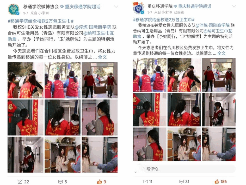 2022年3月8日,第112个国际妇女节,在这个特殊的节日,为让更多人关爱女性、切实实现女性互助,重庆移通学院淬炼·国际商学院青年志愿者协会在双校区开展“予她同行·‘卫’她解忧”关爱女性特别活动,为全校女性师生送上两万包卫生巾福利,微博协会积极参与此次活动的宣传工作,推动线上话题的讨论与热度营造,制作活动相关微博头条文章与视频集锦,联动社会自媒体“重庆小娱”、“重庆校园”发布相关活动话题,登上微博同城热搜榜单第一,阅读量近四百万次,讨论次数超800余次,微信推文《给全校女性送2万包卫生巾,这个妇女节不一样!》浏览量近5000余千次。