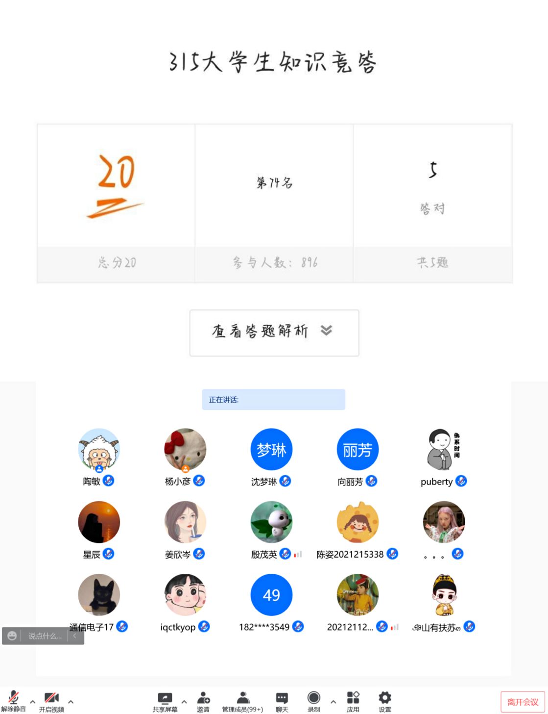 活动接近尾声,采用线上测验的方式开展“315消费权益知识竞赛”,巩固了同学对消费者权益的认识,明确了学生在校园内外的维权渠道。校学生会权益拓展部作为我校学生权益维护的第一防线,势必保证重点关注学生在教育教学、成长成才、生活服务中所遇的权益问题,不断寻求有效解决侵权问题的方法。作为新时代大学生,应当勇于善于抵制侵犯消费权益的一切行为,愿我校学生在生活工作中能够拿起法律武器捍卫自己合法权益。本次线上活动落下帷幕,但权益维护的工作将永远进行,“我为同学做件事”实践活动会继续推进,多角度多方位的展开。学生会权益拓展部也将持续发力,为同学们发声。