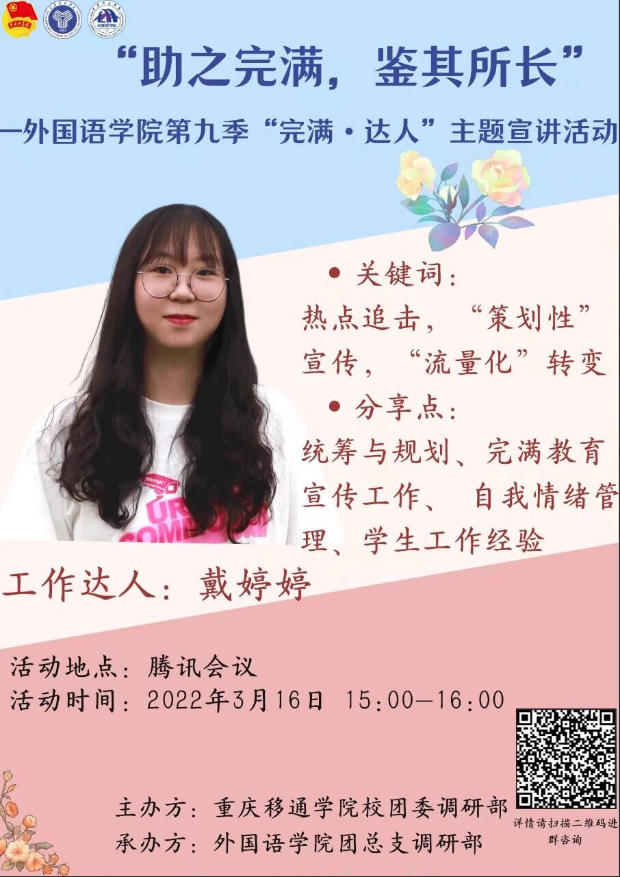 为了解工作达人的工作经验和方法、解答同学们现存的疑惑、提高同学们的工作效率,我院于2022年3月16日诚邀工作达人——戴婷婷学姐作为“助之完满,鉴其所长”——外国语学院第九季完满达人活动的主讲人,并以线上直播的形式开展此次活动。