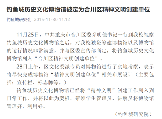 2015年11月25日,四季流转,岁末将至之时,钓鱼城历史文化博物馆列入“合川区精神文明创建单位”。
