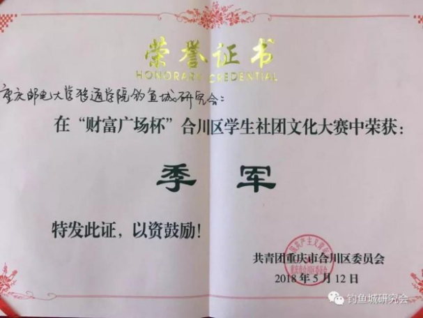 2018年5月,社团人一路收获,一路成长。钓鱼城研究会学生社团秉志笃行,踔厉奋发,在合川区学生社团文化大赛中取得傲人成绩。