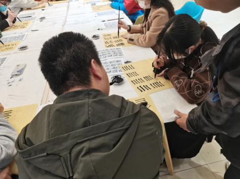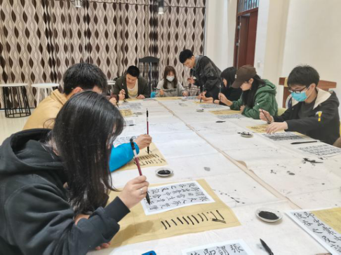 活动伊始,由于顿笔到斜切入笔的转变具有一定的难度,社团干部们耐心地教导大家如何去调控毛笔笔锋的转变,同学们到后面逐渐能够上手,做到神似。每个同学在经过精心的构思后,现场挥毫尽情展示自己的作品。停笔、踌躇、提笔,停提间,是文字与心灵的默契,现场的同学们都沉浸在这人与文字的和谐之中。此情此景,让现场观摩的同学们感受着书法独有的那份细腻与执着。随着时间的滴答,一幅幅作品新鲜出炉,现场的同学们相互交流切磋,在取长补短中共同进步,一气呵成的作品充分展现书法艺术的韵味。