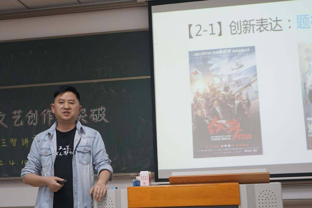 在阐释主旋律的具体内核时,王老师提出同学们在文学作品里书写情绪时,还要注重故事是否遵纪守法。在一定程度上由于时代的不同,也会影响艺术作品的主旋律。故而同学们要学会根据时代背景写故事,这样才能展现出更为真实的情感,从而跨越年龄层,吸引更多的观众。随后,他讲到,要突破就要有创新表达,其包括“题材的开拓”、“选取的目标”和“主题的挖掘”。最后,王智老师提出了自己对于书写文学作品时的一些见解,并向同学们解释其“新主旋律”,主要是围绕着24字核心价值观展开的,它给人传达的是积极向上,爱国的信念感。