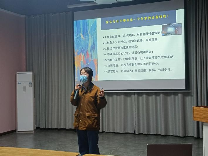 本次讲座以“一个初学者的创作之路”为主题,吴霞霞老师为大家倾情讲解一些有名的文学作家的个性,将大家喜爱的各位知名作家一一举例,如托尔斯泰,莫言,卡夫卡,荷马等,极大地吸引同学们的兴趣。