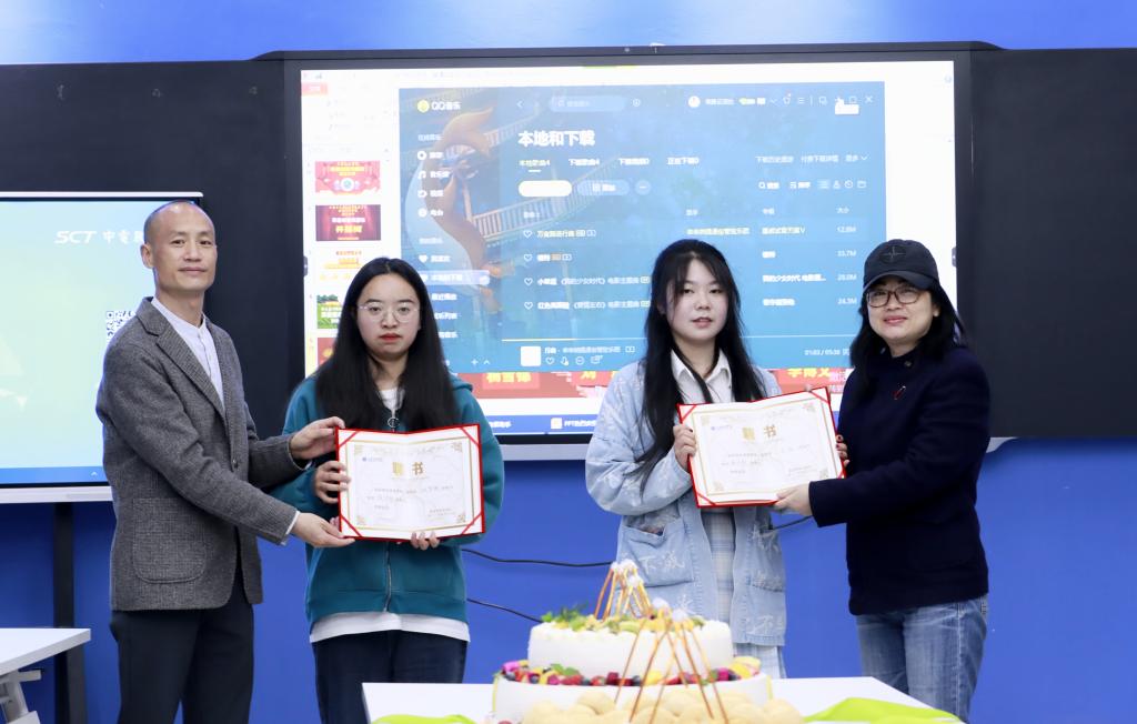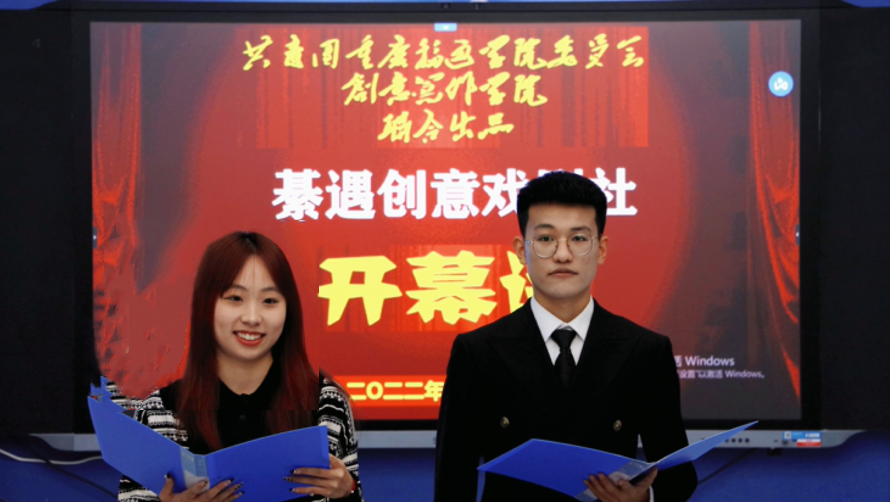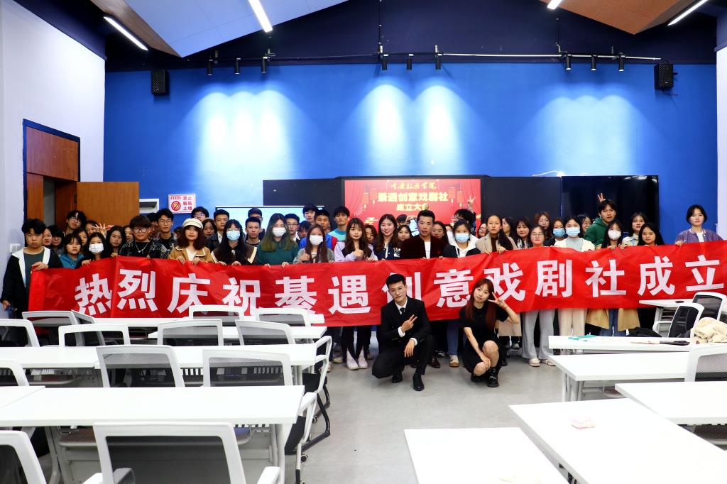 4月17日晚间,移通学院綦江校区朋友圈到处刷评了,全是赏心悦目的图片,精美诱人的糕点酒水,高端现代的綦河书院智慧教室。当然,还有这个新生的戏剧社,崭新的百余名社员以及创意写作学院十余名老师,一张张春天的笑脸,将这个大厅装点的分外靓丽,大家齐声高喊:綦遇创意戏剧社,我们成立啦!