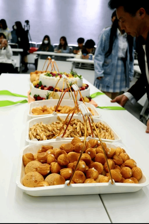 本次成立大会,当创意写作学院的领导和老师全部来到现场时,发现会场已像过年一年热闹而丰富,大家环形而坐,中间摆着四张桌子,上面摆放着双层大蛋糕,还有四五种美食,都用精美的大托盘盛装而来,外加一大桶冰栋柠檬水,颇有气势地伫立一旁。为了让场面更诱人一点,王恒绩老师干脆拿掉了蛋糕的透明保护罩,双层大蛋糕完美地露出了俏丽的真容。
