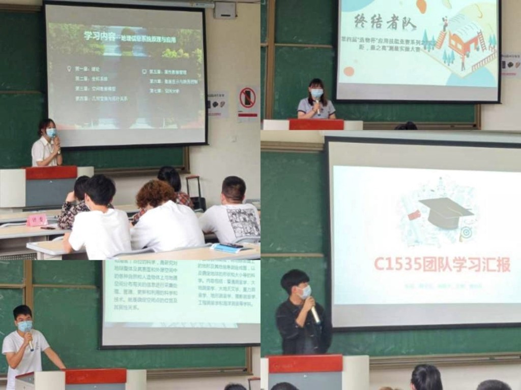 在本次比赛前,参赛选手们已经进行了一段时间的线上课程学习打卡,初步地了解和学习了地理信息系统原理与应用及不动产测量的相应知识,下面就到了考验参赛选手们理论学习成果与实践操作应用的时间了。首先进行的是团队学习汇报环节,每组团队派出一名代表上台汇报团队学习成果,阐述学习心得历程及学习收获,并由评委老师进行提问交流。各组小队代表带着他们独特的团名上台,用ppt展示出自己团队的学习知识成果,经过了他们的介绍讲解,同学们对地理信息系统、空间坐标系统、不动产图测绘、高差闭合差计算等所学的知识有了更深刻的理解,在面对评委老师的提问时,也能从容不迫的回答,给出合理的方案。