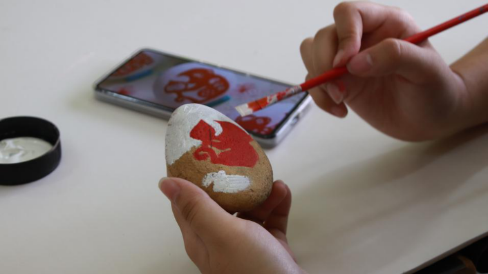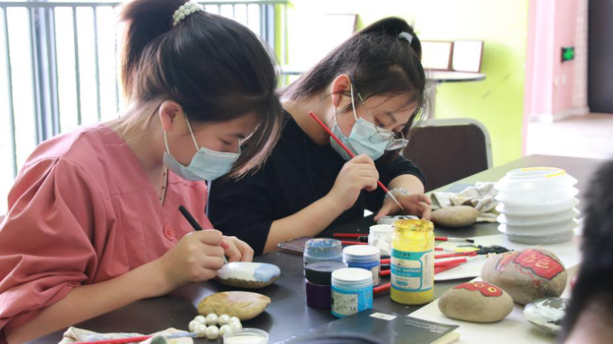有秀女弹古琴、台上唱戏曲、篆刻书法、蚕桑丝织宣纸手艺,非遗文化重现于石头之上,拥有更强的生命力,传递每一份石头最真挚的历史文化。接前人传承,展文化风采。4月22日下午,绿色社团联盟联和传统文化社团联盟在C区活动室开展第二期“石头上的绘画”之“笔刷下的非遗”,以清雅的色调,奇妙的构思,再加上虚实相间的表现手法,把一块块普通石头变成艺术品。将画融入石中以石之永恒存非遗色彩表承非遗之决心。