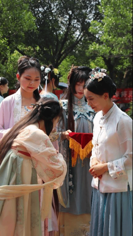 男子成人称“冠礼”,女子成人称“笄礼”。正宾一般由女性长辈担任,因此特邀杨敏老师作为正宾为礼者加礼。先是女子入场,由正宾净手理衣、及簪、盘发,仪式结束后向正宾行礼;后男子入场亦需净手以示敬意,正宾为他们一一带帽加冠。