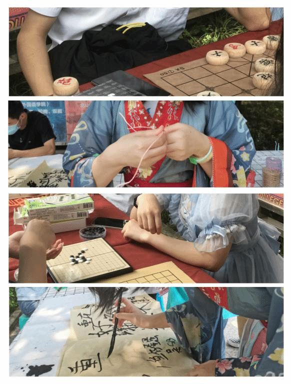 此外,现场还布置有手工摊点,以让观众们在观赏成人礼的同时,进行活动体验,提升其参与度。其中DIY手工协会进行的是纸制藤编,激发体验者们的动手能力;书法与美术协会提笔落墨绘显大观,现场盛况于一字一笔间展现,又写先贤之思,可警预当世;逸轩棋社与体验者们进行黑白棋子的较量,小小棋盘,步步为营,变幻莫测。摄影协会则寻找角度,记录活动风采,将美好定格。