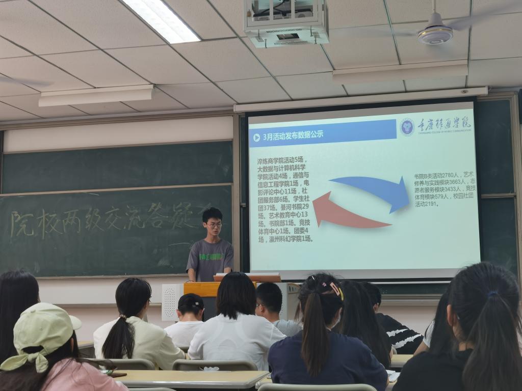 会议之初进行了4月份的月度数据公示。以活动发布场次,参加活动人数,各模块积分获取情况三部分进行分类总结。4月份共发布活动113场,其中学生社团发布活动最多,高达37场。从参与活动人数上看,总人次为12646人,在各模块中艺术修养与实践模块稳居第一,有3663人。各模块积分排名前三的同学均远远超过合格标准。最受欢迎的活动是[綦]“传递手中红,拥有隐形盾”线上活动,其参与人数达1277人,获取了96%的好评率。
