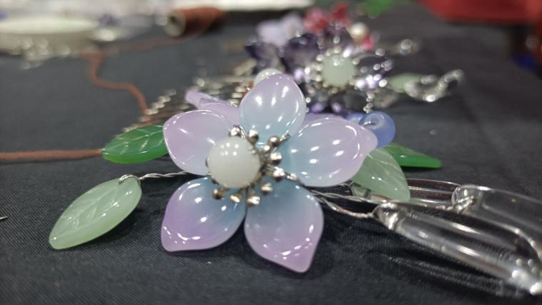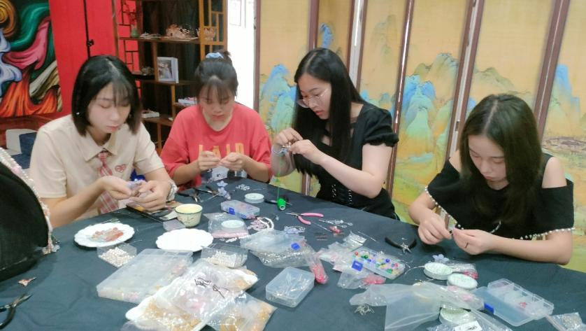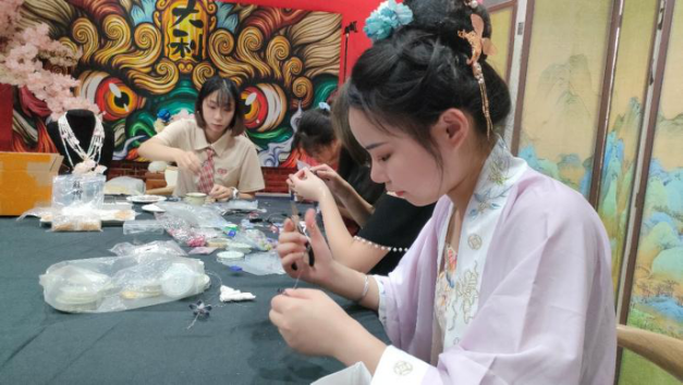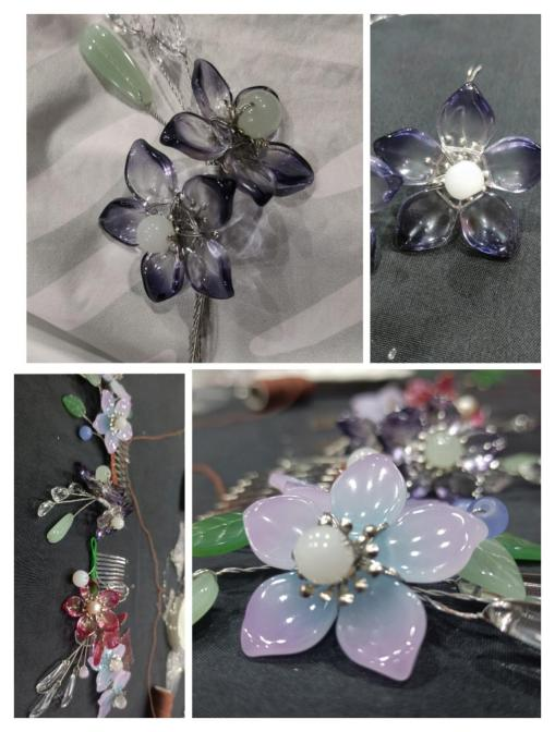 通过课堂的形式,何鑫玥学姐向学员们讲述琉璃花瓣如何才能制成一朵精美的琉璃花;通过实践操作,增强学员们的动手能力;通过面对面指导,能够切实地体验制琉璃花簪的技巧;通过小规模参与,能够更好地调动每位学员的积极性,提升教学质量。学员们在两个小时的课堂里,穿“珠”引线,垂眸串花,经历过将铜丝线扭断,方知拧铜丝时对手上力度要把控;铜丝线穿孔的困难,可以借助钳子,学姐也细心提醒大家把对钳子用力的方向切勿对准自己,避免失手受伤。