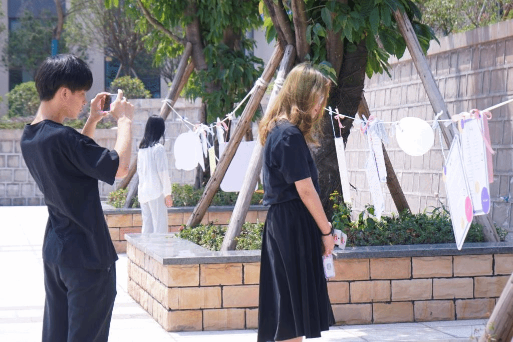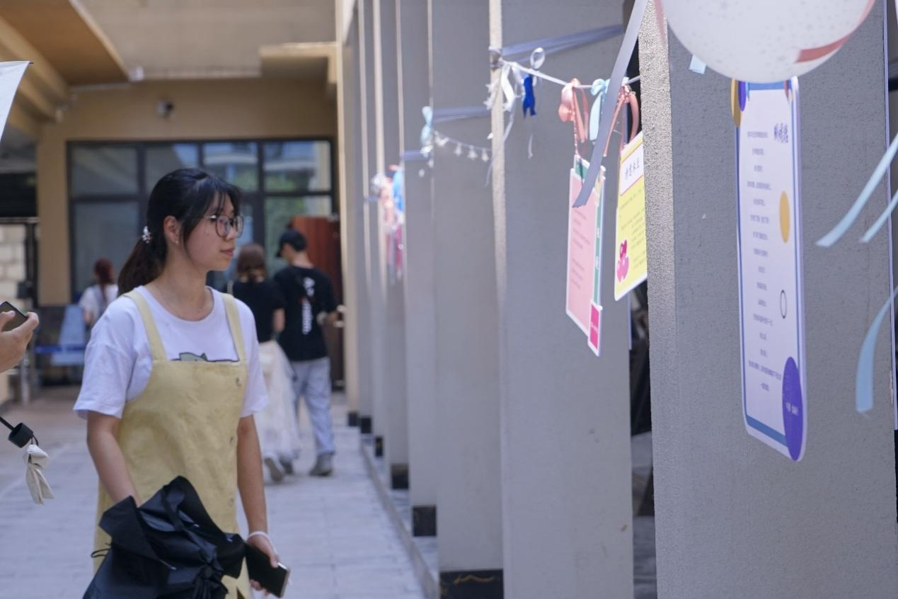 二号楼中庭,打卡签到处,工作人员把作品装饰得很是唯美。同学在作品面前驻足、阅读、欣赏,有一人独自在前深思、有无奈摇头、有认可点头。这不仅仅是对每一种爱情的感受,也是对文字的欣赏。